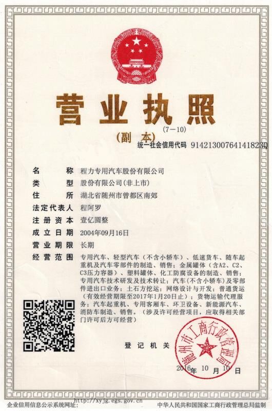 程力專用汽車股份有限公司:2013年3月12日,由湖北程力專用汽車有限公司更改為程力專用汽車股份有限公司,簡稱“程力專汽”。公司注冊資金為壹億伍仟玖佰萬圓整。公司集研制、開發、制造、銷售、售后服務于一體,程力公司已率先全面通過ISO9001-2000國際質量體系認證,產品全部通過3C國際強制產品認證,并通過出口產品的各項認證。