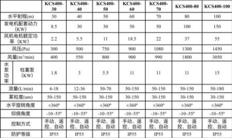 采用鄭州鄭通霧炮,型號為KCS400-100,水平射程100米,發電機配套動力150千瓦,風機電機額定功率55千瓦,風壓1450pa,風量3050立方每分鐘,水泵為柱塞泵,水泵功率15千瓦,流量50-180L每分鐘,霧粒度30-150urn,水平旋轉角度±360度,仰俯角度-10到55度,控制方式:手動、遙控、自動,防護等級IP55。